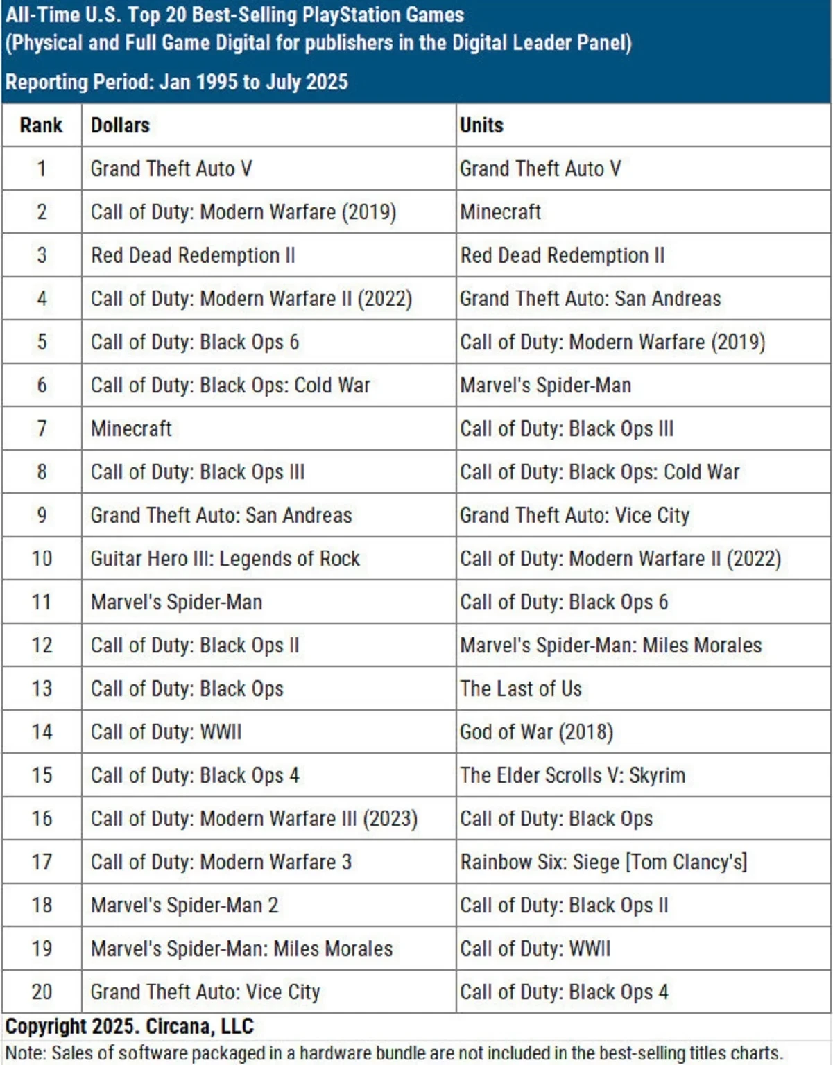 Ещё одним мастодонтом в чарте стала Call of Duty. Шутер Call of Duty: Modern Warfare (2019) идёт сразу после GTA 5 с точки зрения долларовой прибыли, но находится на пятой строчке по числу продаж. Зато второе место с точки зрения тиража отведено песочнице Minecraft. Разные части COD разбросаны по чарту: более десяти разных игр, включая последнюю на данный момент Call of Duty: Black Ops 6.