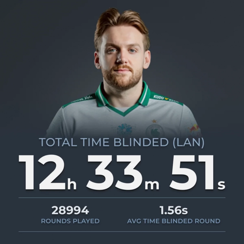 Ещё больше интересных видео на YouTube канале Игромании!Источник: HLTVНикола «NiKo» Ковач, рифлер Team Falcons, по расчётам пользователя Reddit Away_Active7903 суммарно провёл в ослеплённом состоянии 12 часов 33 минуты 51 секунду на LAN-ивентах за карьеру. В выборке — 28 994 сыгранных раунда; среднее «слепое» время составило 1,56 секунды за раунд.
