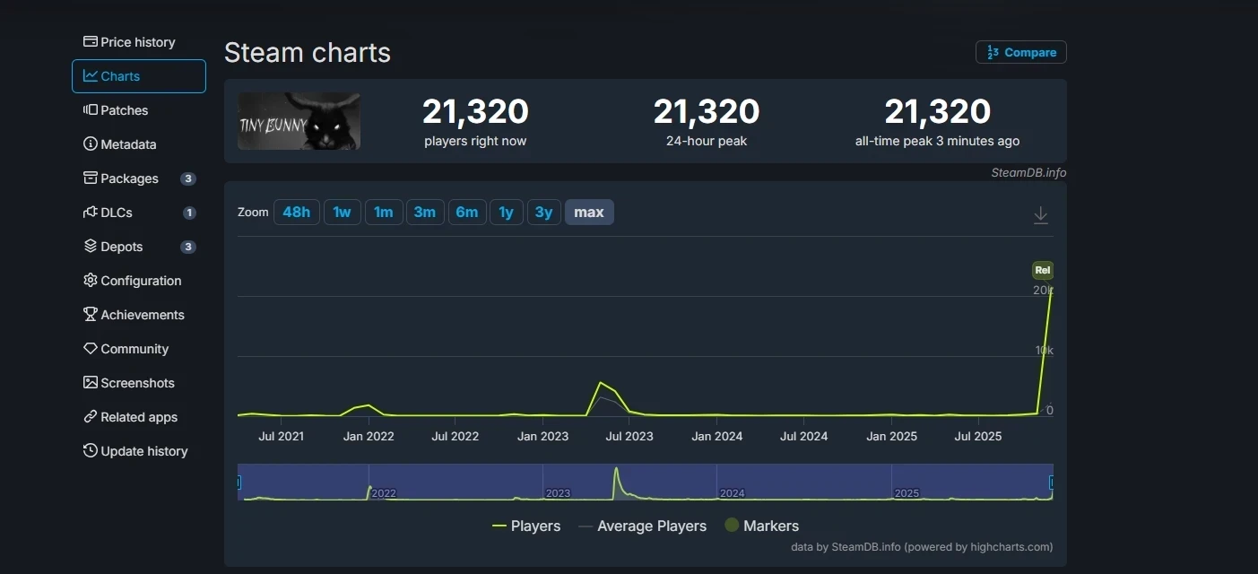 До сегодняшнего дня пиковым онлайном «Зайчика» в сервисе Valve был показатель в 5,6 тыс человек — он был установлен в 2023 году, сразу после выхода четвёртого эпизода. Но теперь в визуальной новелле находится уже более 20 тысяч человек — и это число всё растёт!