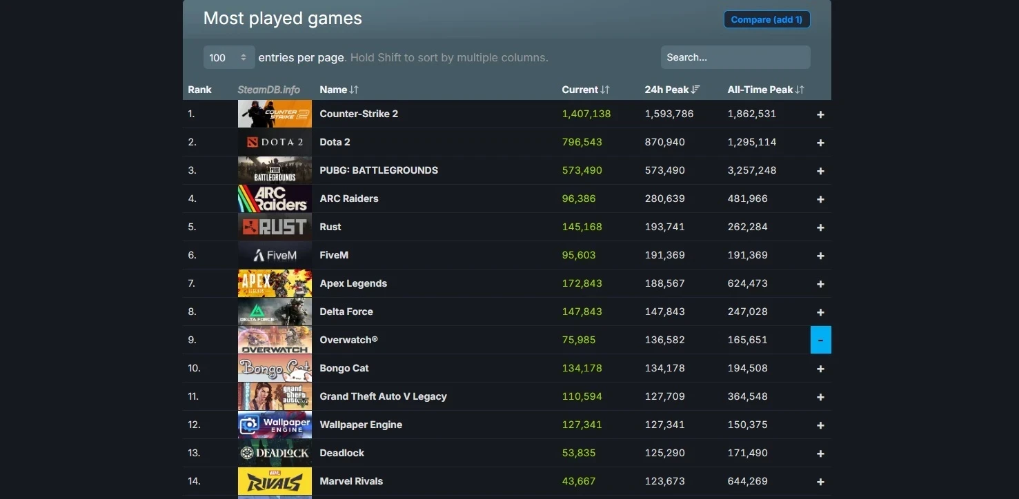 Сегодня Overwatch, уже без 2 в названии, обошла Marvel Rivals и Grand Theft Auto V Legacy. Ей немного не хватило, чтобы обогнать Delta Force.