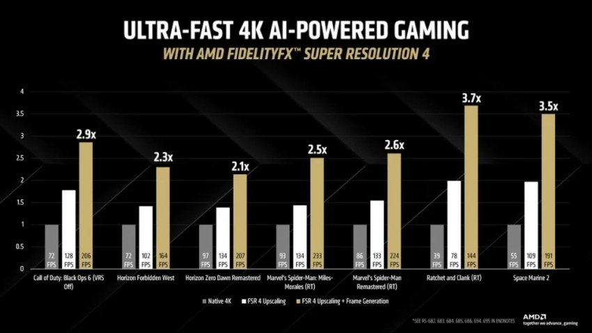 - На примере Warhammer 40K: Space Marine 2 наглядно показали возможности технологии. Если в нативном режиме 4K шутер выдавал 53 FPS, то с FSR 4 и генерацией кадров результаты достигали 182 FPS.