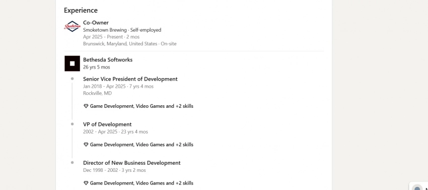 Тодд Вон, старший вице-президент по разработке, указал на своей LinkedIn-странице, новое место работы с апреля этого года — пивоварня Smoketown Brewing (ещё он является её совладельцем). Этот же месяц значится последним рядом с Bethesda Softworks, в которой Вон трудился более 26 лет.