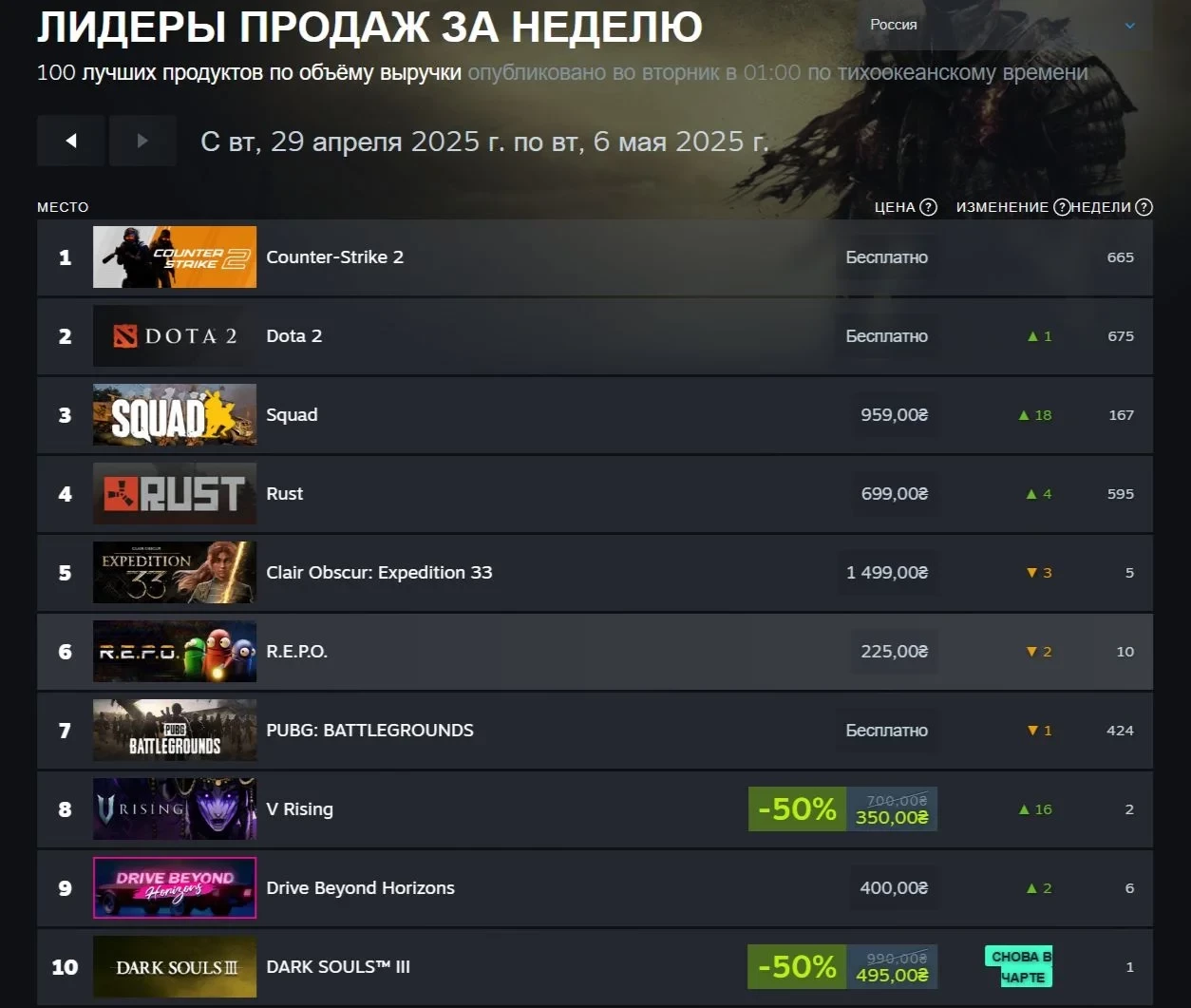 Крепко удерживаются в десятке постоянные обитатели чартов: Counter-Strike 2, Steam Deck, PUBG: Battlegrounds, они лишь меняются местами. Не сдают своих позиций и популярные R.E.P.O и Schedule I. Из «возвращенцев» можно отметить V Rising: игра недавно получила крупной обновление, да ещё и продаётся за полцены.