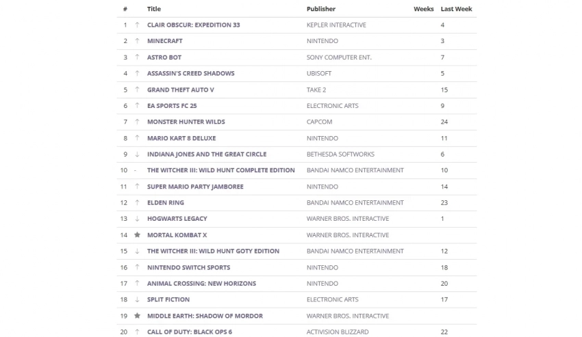 Французское ролевое приключение смогло обойти таких гигантов, как Minecraft, Astro Bot, Assassinʼs Creed Shadows и GTA V. Именно эти игры расположились на вершине прямо за «Экспедицией 33». А ранее лидировавшая Hogwarts Legacy теперь находится только на 13 строчке.