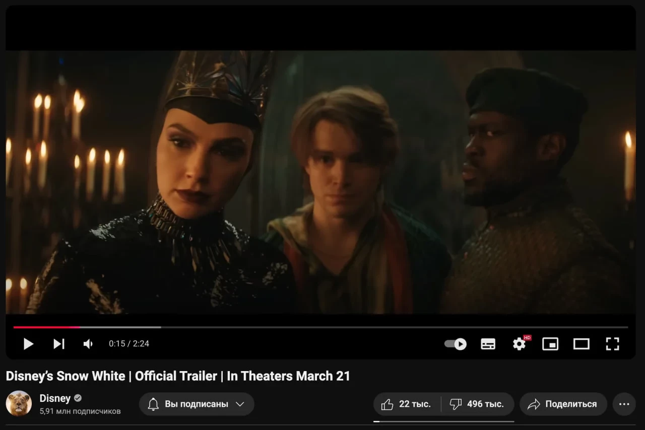 Самое интересное о кино на YouTube канале Игромании!Обложка: кадр фильма «Белоснежка»Зрители «не оценили» трейлер ремейка «Белоснежки» Disney — ролик получил почти 500 тысяч дизлайков на YouTube при 22 тысячах лайков.