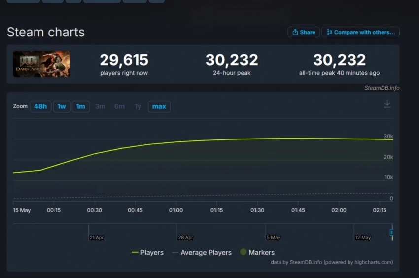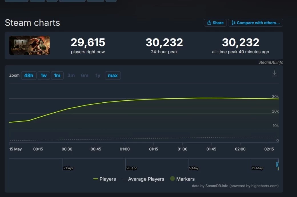 Пиковый онлайн DOOM: The Dark Ages в Steam превысил 30 тыс — до DOOM Eternal пока далеко