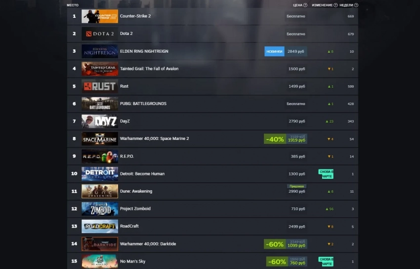 В российском чарте, впрочем, Elden Ring Nightreign оказалась лишь на третьем месте, её обошли не только Counter-Strike 2, но и Dota 2. По-прежнему находится на лидирующих позициях польская ролевая игра Tainted Grail: The Fall of Avalon. Вдобавок в чарт внезапно вернулась Detroit: Become Human, которая неделю назад отпраздновала своё пятилетие.