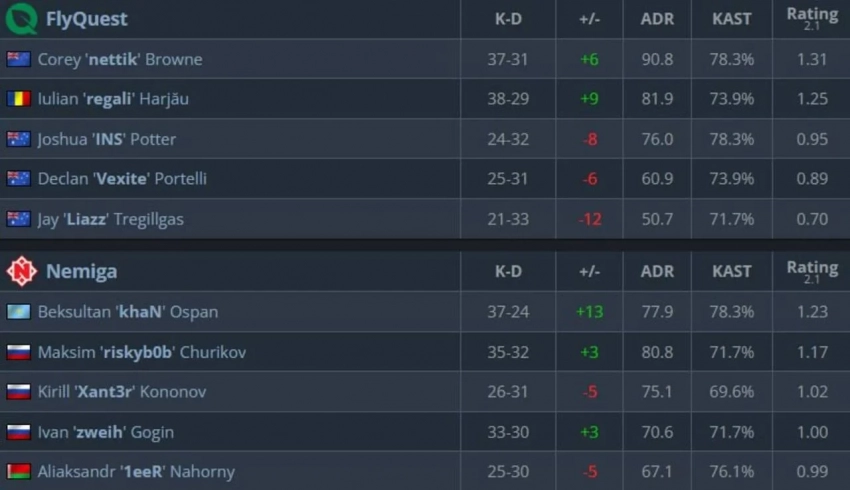 Тем временем, коллектив Nemiga также продемонстрировал отличную игру, обыграв австралийскую FlyQuest со счетом 13:9 на Ancient и 13:11 на Inferno.