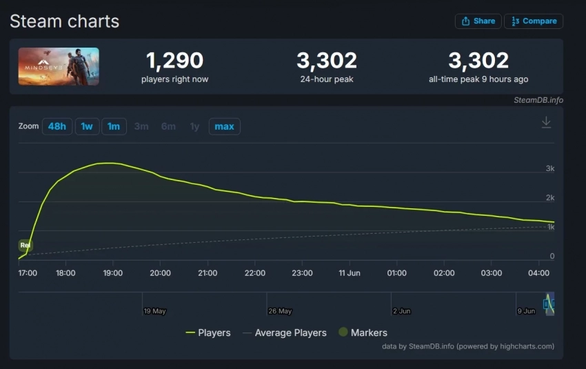 В Steam пиковый онлайн новинки поднялся до 3 302 человек одновременно, но уже опустился до 1,2 тыс.