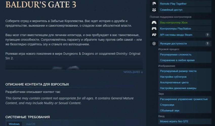 Самое интересное о кино на YouTube канале Игромании!Скриншот Baldur's Gate 3Valve объявила, что на страницах игр в Steam появилось отображение существующих функциях доступности. По умолчанию это меню свёрнуто, а возможности в нём сгруппированы по категориям. Эти же категории и функции теперь игроки смогут учитывать при поиске игр.