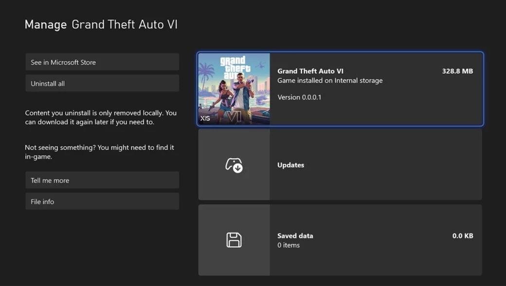 Для этого нужно связать мобильное приложение Xbox со своей консолью и зайти на страницу GTA 6 для удалённой установки игры. Тогда на Xbox Series начнётся загрузка файла размером в 328,76 МБ. При попытке запустить игру появится ошибка. Сам установочный файл наверняка является «заглушкой» для возможной предзагрузки незадолго до релиза GTA 6.