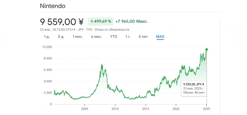 На момент открытия торгов 23 января акции Nintendo выросли до 9775 иен (примерно 6213 рублей). Это максимальная цена за всю историю Nintendo: предыдущий максимум остановился на 371 иену ниже. На пике стоимость акций не удержалась, но аналитики из Toyo Securities прогнозируют, что она может вырасти вплоть до 12 300 иен.