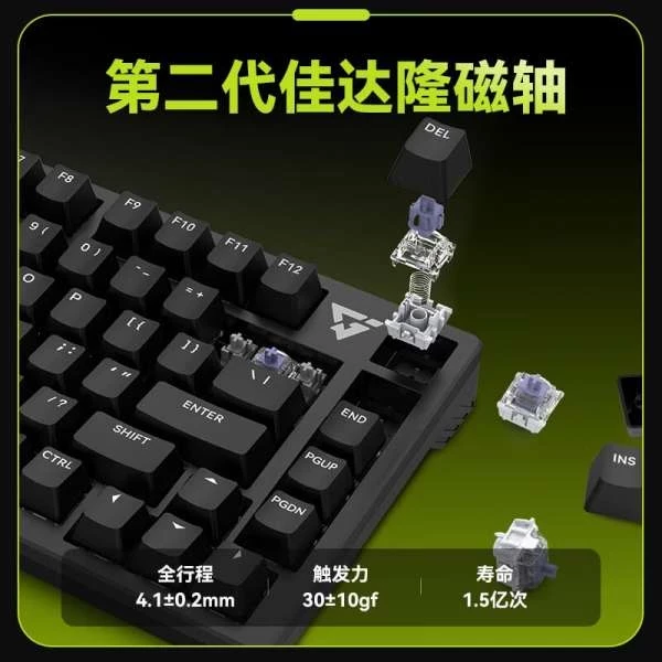 Клавиатура имеет компактную 75-процентную раскладку, позволяющую сэкономить место, сохранив при этом важные для игр клавиши. Она оснащена магнитными переключателями Kailh второго поколения. Эти переключатели славятся своей долговечностью и отзывчивостью, обеспечивая срок службы до 150 миллионов нажатий. Они также позволяют полностью настраивать диапазон срабатывания от 0,1 мм до 4,0 мм, обеспечивая 40 ступеней настройки для различных игровых стилей и предпочтений.