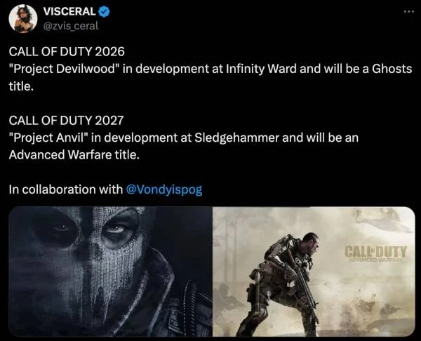 Несмотря на то, что Call of Duty этого и следующего года еще не анонсированы, у нас уже есть некоторая информация о играх, намеченных на более отдаленное будущее. Как сообщает инсайдер Том Хендерсон, Call of Duty 2025 года станет полуфутуристическим сиквелом Black Ops 2. А согласно недавнему посту другого известного информатора VISCERAL в твиттере, игра Call of Duty 2026 года разрабатывается студией Infinity Ward под кодовым названием Project Devilwood и будет представлять собой новую часть подсерии Ghosts. Кроме того, он утверждает, что Call of Duty 2027 года с кодовым именем Project Anvil станет продолжением Advanced Warfare от Sledgehammer Games.