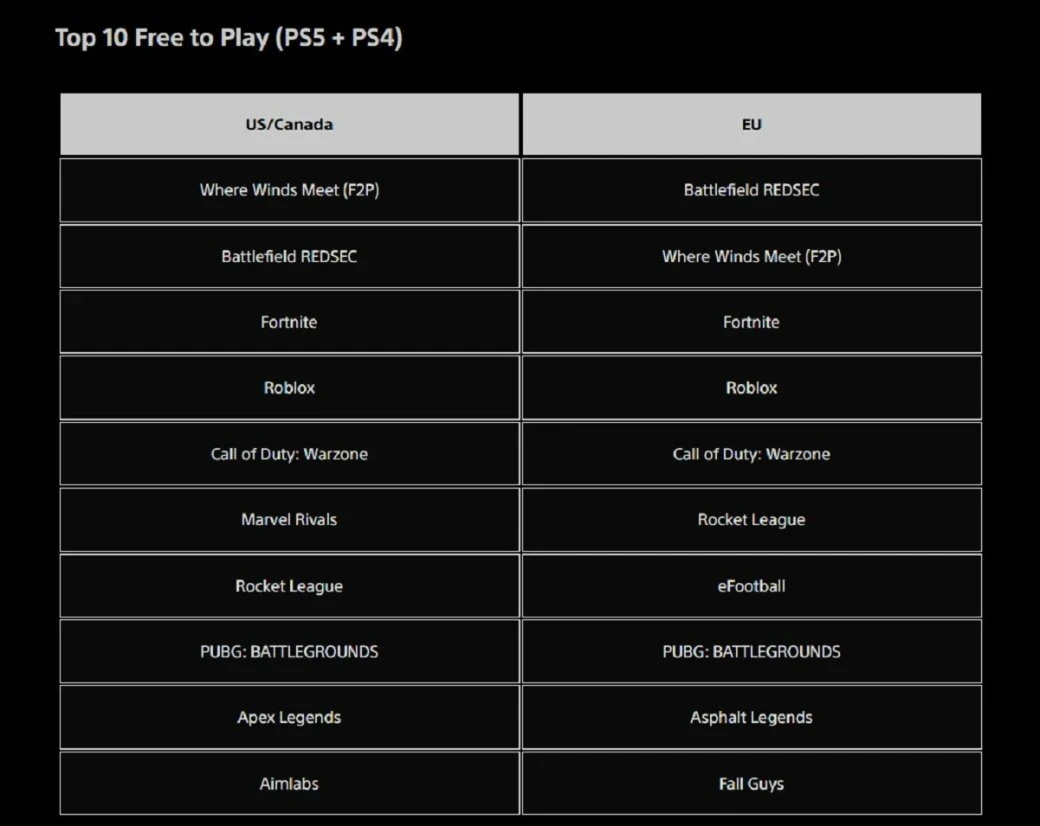 Среди условно-бесплатных игр есть несколько серьёзных изменений в сравнении с октябрём. Первое место в США и Канаде заняла ролевая игра Where Winds Meet, которой не составило труда обогнать Battlefield RedSec, Fortnite и Roblox. При этом ответвление Battlefield 6 занимает первое место в Европе.