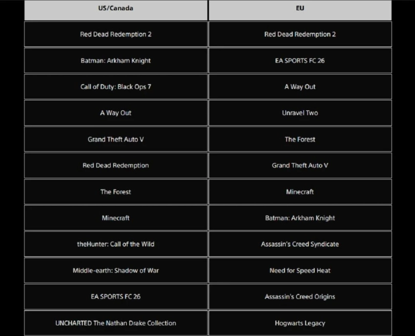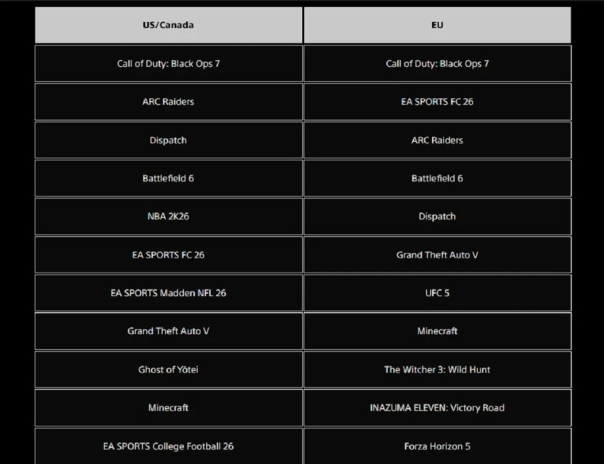На обоих рынках на четвёртом месте расположилась Battlefield 6. Среди других относительно свежих игр геймеры из обоих регионов наслаждались Ghost of Yotei. А в Европе в топ-20 по загрузкам вошли Anno 117: Pax Romana и Inazuma Eleven: Victory Road.