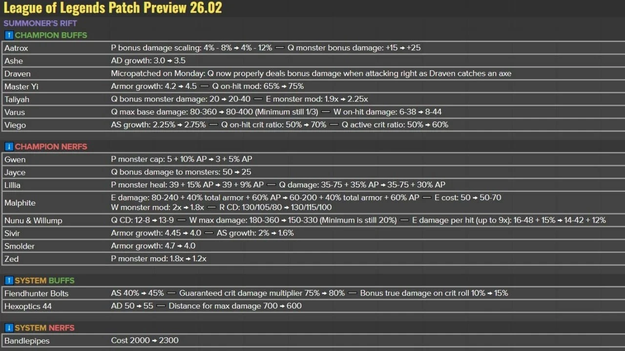 Обновление 26.2 (16.2) будет установлено на боевые серверы в ночь на 22 января 2026 года. Полный список изменений с точными цифрами урона и кулдаунов появится на официальном сайте Riot Games за сутки до релиза — 21 января.