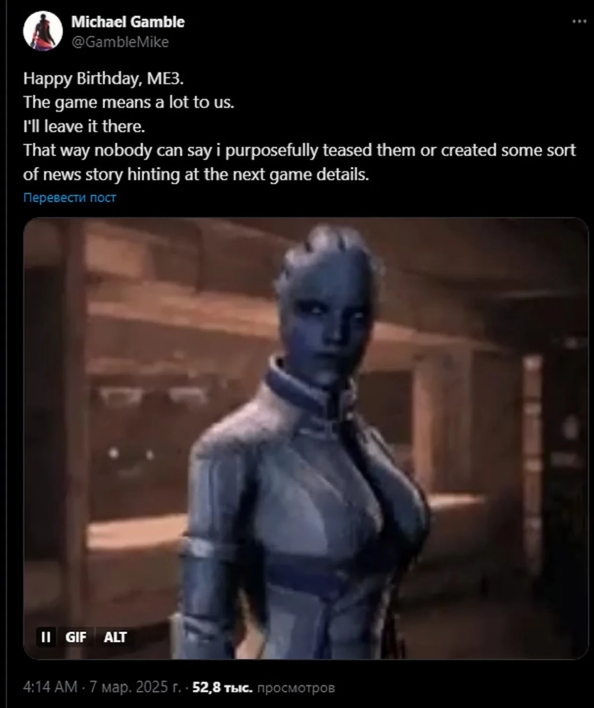 «Майкл Гэмбл выложил загадочный пост с упоминанием „намёка на следующую игру“ и отсылкой к Mass Effect 3», — описывает происходящее один из поклонников.