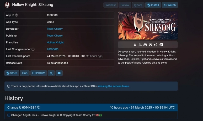 Оказывается, что у «Силксонга» сегодня, 24 марта, обновили данные в Steam. В частности, изменения коснулись авторского права Team Cherry на проект, где теперь указан не 2019-й, а 2025-й год. Кроме того, упоминается потенциальная поддержка Geforce Now для игры.