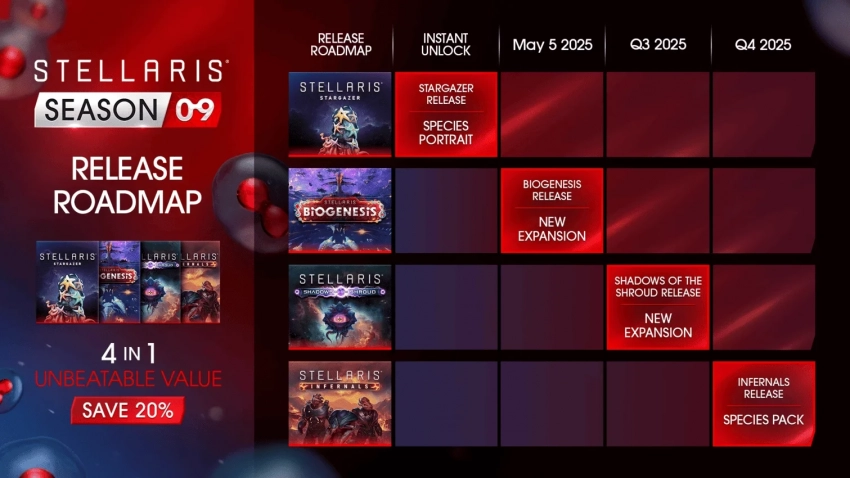 Первое крупное обновление, BioGenesis, выйдет 5 мая 2025 года. В нем игроки смогут создавать живые корабли, заниматься терраморфингом целых экосистем и использовать генетические инструменты для трансформации своей империи.
