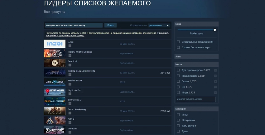Silksong потеряла позицию лидера, но далеко не упала — она занимает второе место в списке желаемого Steam. На третьей строчке можно увидеть новый шутер Valve под названием Deadlock. На четвёртом — спин-офф Elden Ring Nightreign, который выходит 30 мая. На пятом — меха-шутер Mecha Break.