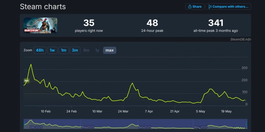 Achilles: Survivor — нишевая игра, поэтому неудивительно, что она привлекла лишь 341 человека на пике в Steam спустя несколько дней после релиза. Всплеск онлайна случался после обновлений, однако за последние пару месяцев пик ежедневного онлайна незначительно вырос — вероятно, из-за обрастания контентом и приближения к полноценному релизу.